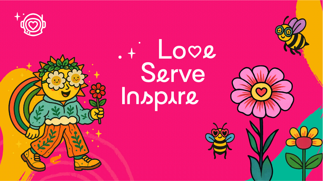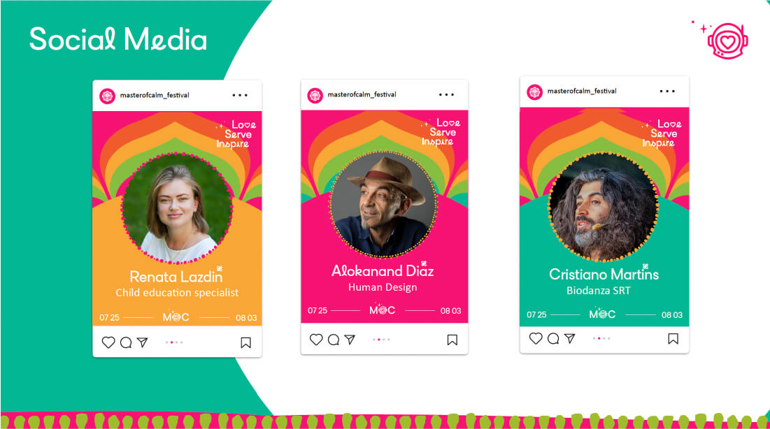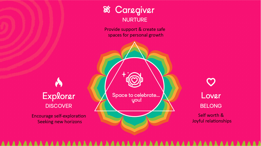 Color leads with Magenta, courage from the heart. Lively secondaries keep the mood playful and inclusive. A child astronaut with a heart reflected in her visor says the search is inward; elemental guardians—Water, Fire, Wind, Earth—stand beside the Sacred Oak and Sacred Guide. The design feels human, handmade, and welcoming.