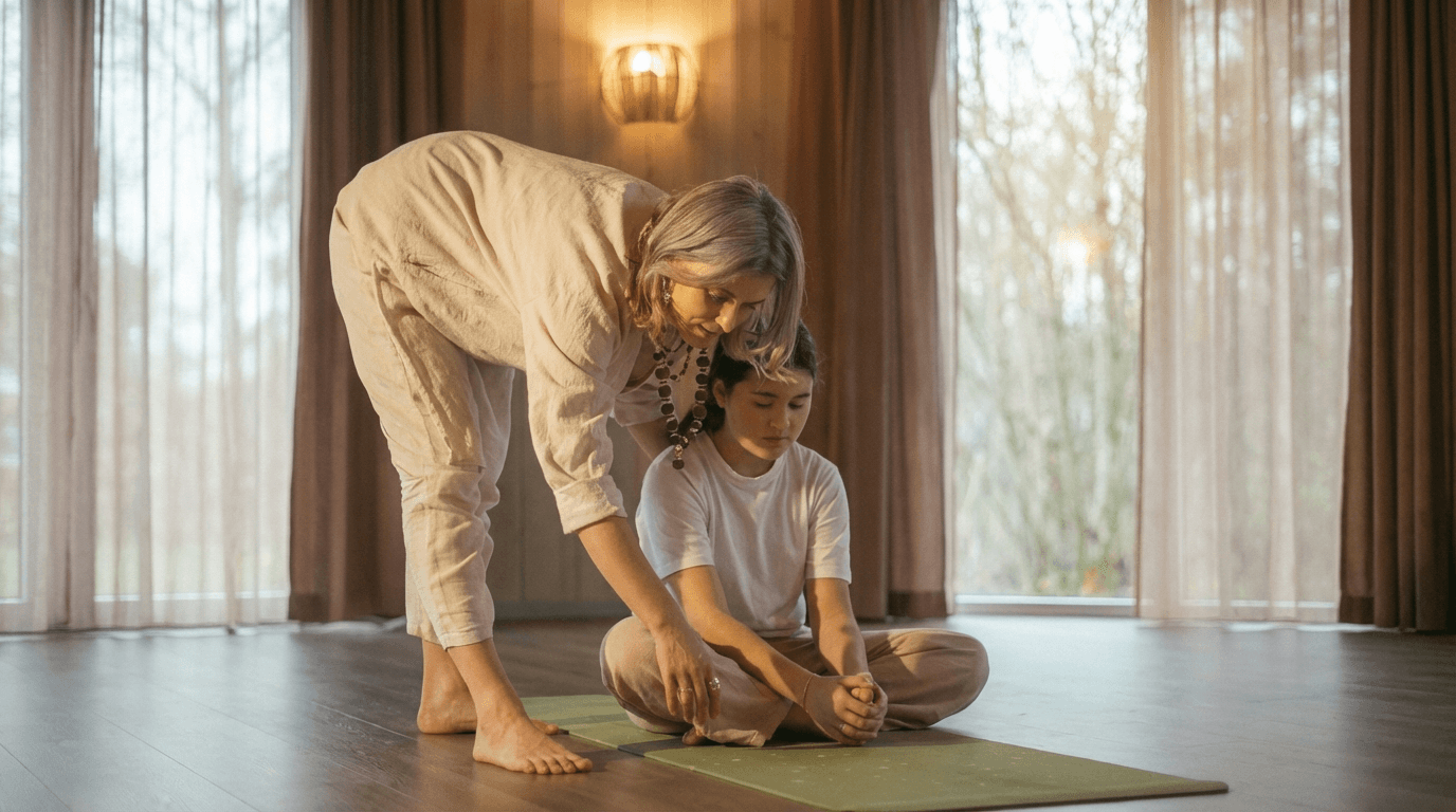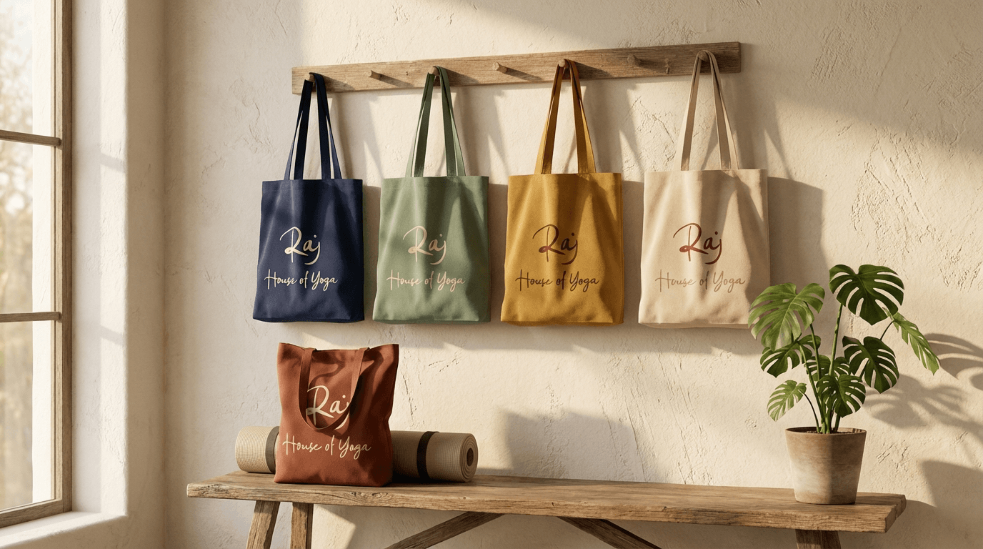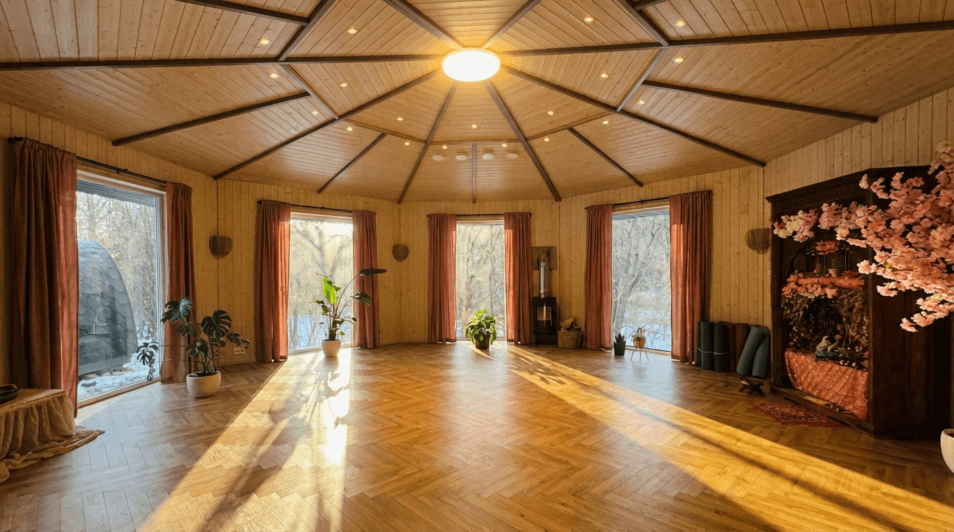 Natural wood, hand-touched textures, honest light. The design carries the feeling of the valley itself, earthy, warm, sacred without being heavy. At the heart of the studio sits a quiet shrine, Gopīśvar Mahādev present as a modest Śiva Liṅgam, with fresh water, flowers, a small flame. Sacred, yes. Sectarian, no. It’s a centre of gravity that invites stillness without asking for a label. The visual identity breathes the same quality: organic forms, soft greens and golds, the feeling that someone has tended this space the way you tend a garden.