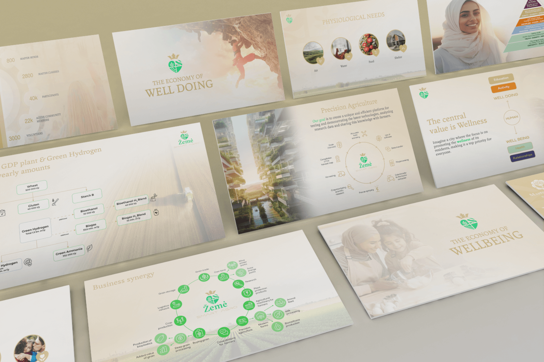 You see the calm before the pitch: modern green with measured gold on slate and ivory. A refined serif meets a precise sans. Lines echo pivot circles, drip networks, dunes; images move from hands and seedlings to aerial systems. It reads as elegant engineering—supportive, exact, assured.